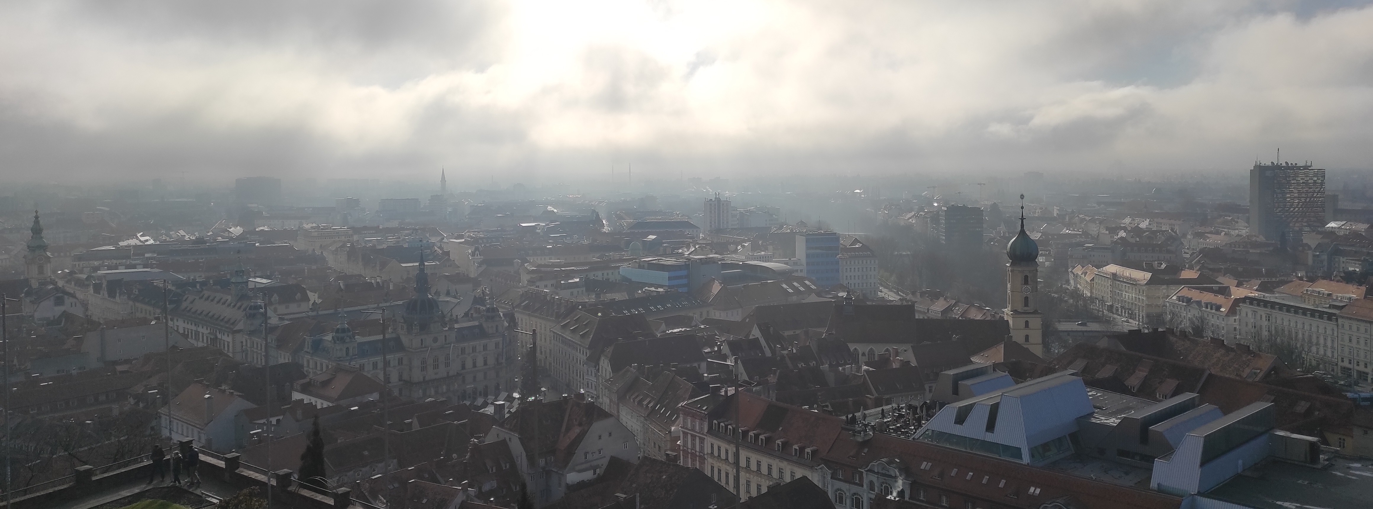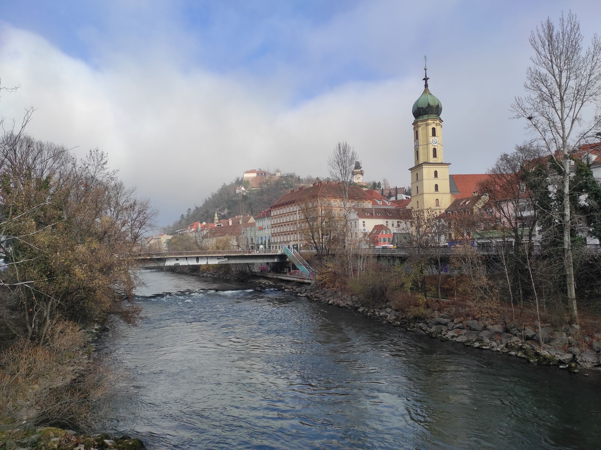 I stayed at a hotel overnight, and the next day, I had some time to actually explore. This meant starting by crossing the shallow, fast-flowing river Mur and heading back to the main square: it was a day with occasional sun, but also a lot of low cloud and fog in places, so that when I set out there were still wreaths of mist around the Schlossberg hilltop that overlooks the centre of the city. The market was not yet open, and the buildings around the city hall still had their wooden shutters closed. Cosiness, after all, to some extent demands contrast with the colder, less world beyond. Beneath the Graz goldilocks effect as a whole this fact lurks, the out-of-sight reminder of a particularly vicious twentieth century legacy. As one of my colleagues had noted the night before, some of the nicest city-centre architecture was built or spruced up during the fascist period to claim homes for Austria's Nazi aristocracy. Vociferously left-wing as the city may be today, Graz's charms are no less charming to the extremes of the right.