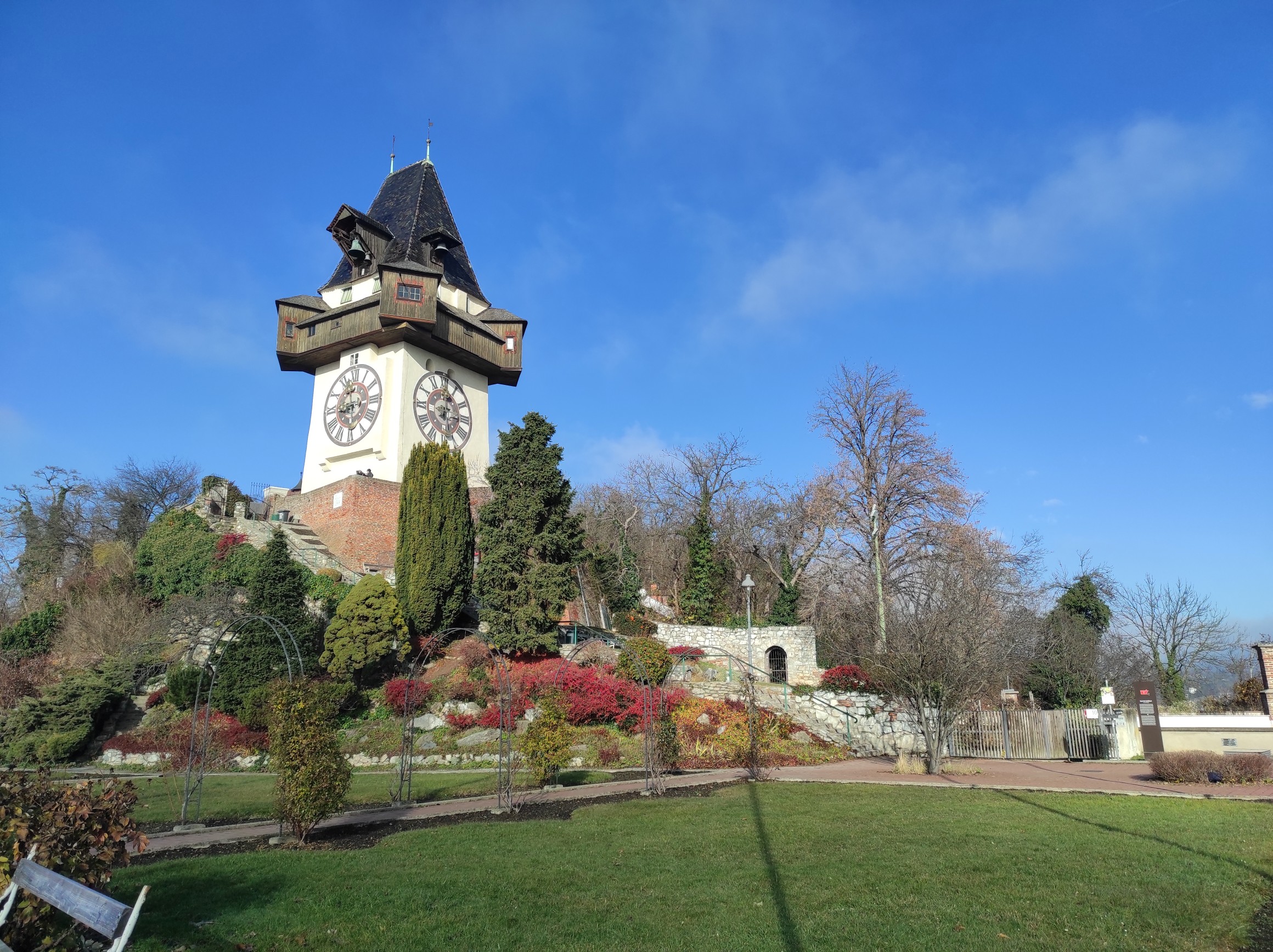Some remnants remain of bastion walls and, most visibly, of the clock tower, parts of which date back to the middle ages and which is now the most visible landmark on the Schlossberg from across the centre of the city. The tower has three bells – the oldest one is for the hours, but there is a second that was traditionally the fire bell, and a third that was apparently used for curfews and executions. A rose garden below the tower occupies the position of an old bastion, with a small building built as a gift to bastion's commander from that last Napoleonic defence – it now serves as a residence for writers and artists being recognised by or seeking refuge in the city. Here, one can look out over the city itself. For me, it sat under a dappled mix of late autumn light and brooding cloud, as if uncertain under which of the two it really belonged.